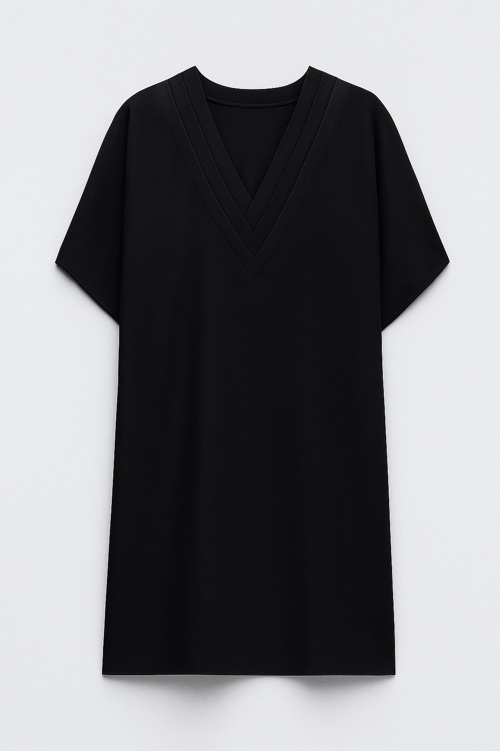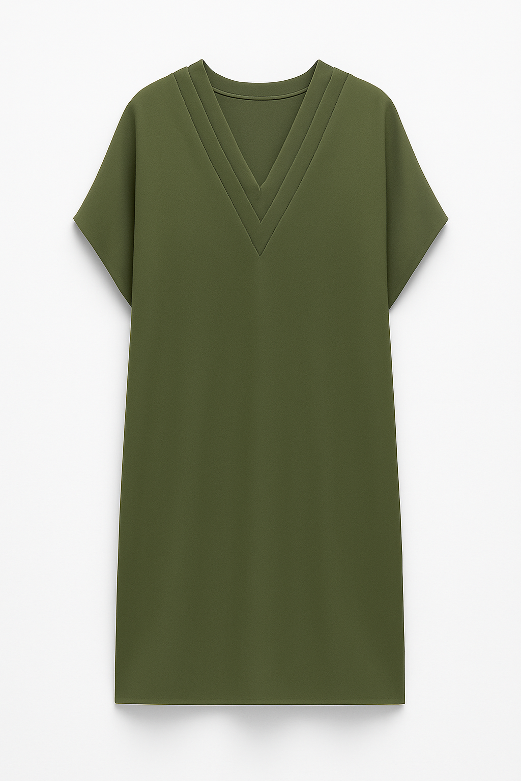 Denne model har en dobbelt V-udskæring med bred kant, som skaber en elegant linje og forlænger halsen visuelt. De korte ærmer falder let og løst, hvilket giver bevægelsesfrihed og en luftig fornemmelse. Det lige snit følger kroppens linjer uden at stramme, og balancerer raffinement med komfort. En lille slids i sømmen tilføjer et diskret og moderne touch.