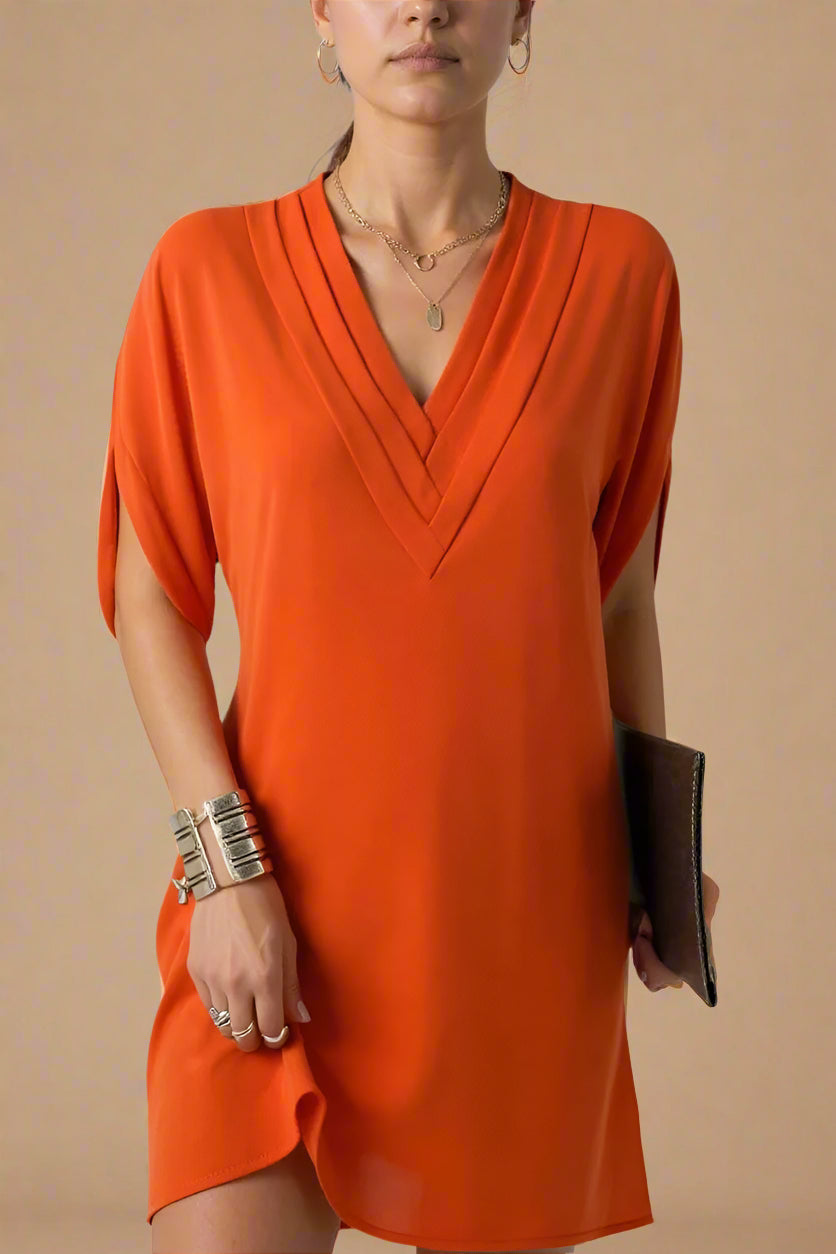 Kort kjole med struktureret V-udskæring, løse ærmer og lige snit.